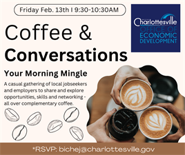 You’re invited to start your morning with coffee, connections, and conversation at the next Coffee & Conversations event hosted by the City of Charlottesville’s Office of Economic Development.